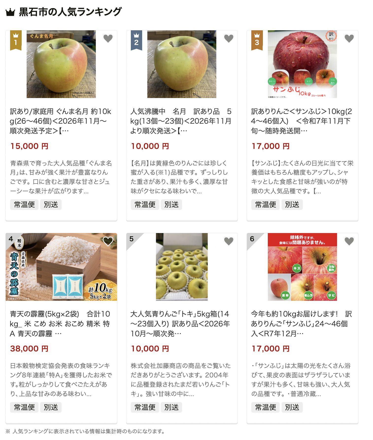 青森県黒石市のふるさと納税は、“りんご特化型”の返礼品がランキング上位をほぼ独占しているのが最大の特徴です。最新の人気ランキングでは、「ぐんま名月」や「サンふじ」といったりんごの訳あり大容量セット(約10kg)が1位・3位にランクインしており、家庭用としてコスパの高さが高く評価されています。さらに、5kg前後の食べやすいサイズや、人気品種の詰め合わせなども上位に入り、用途に応じて選べる点も魅力です。