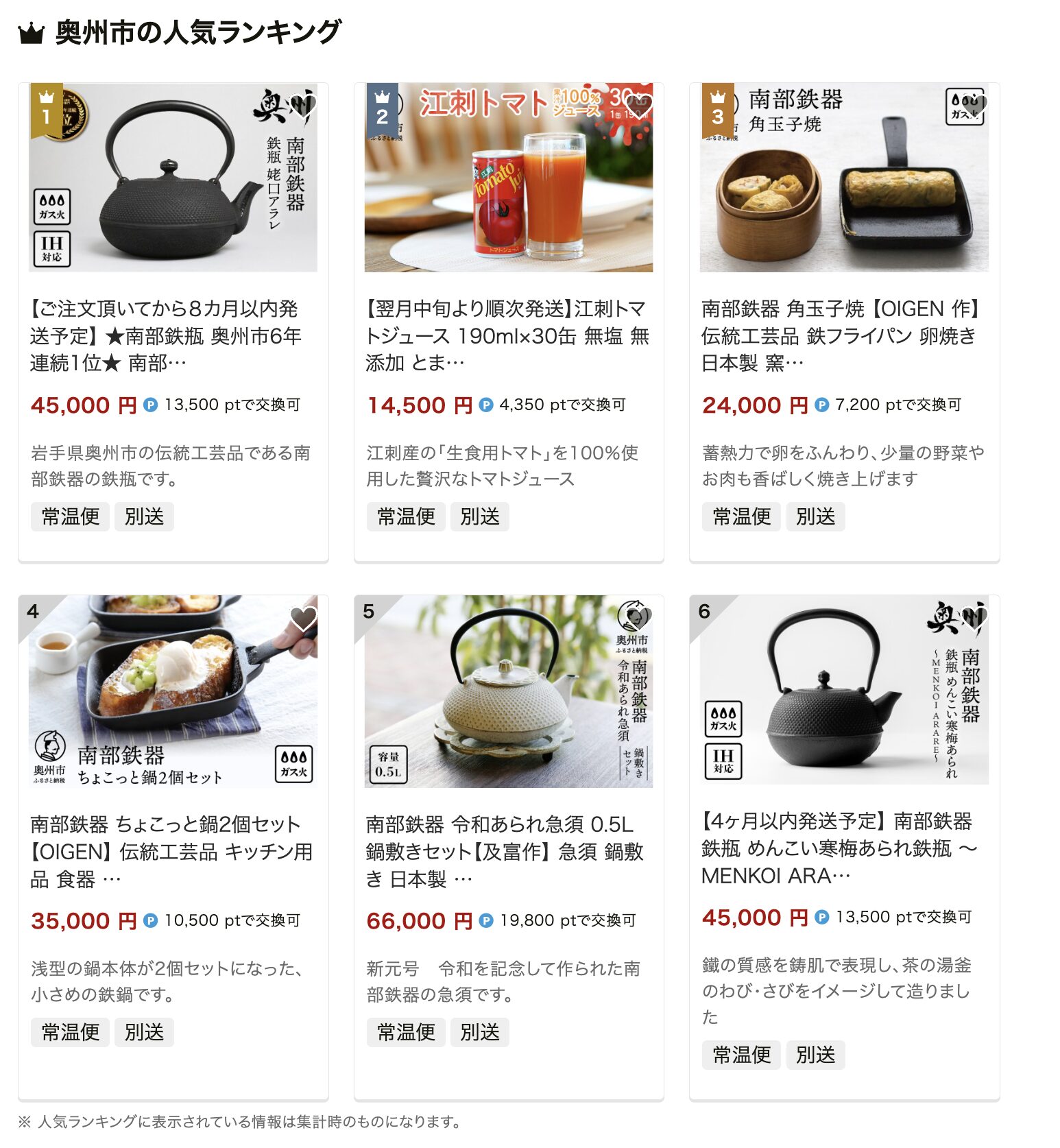 続いて、トマトジュースや南部鉄器の卵焼き器など、日常使いできる食品・キッチン用品もランクイン。さらに、急須や鍋、フライパンなどバリエーション豊富な南部鉄器製品が並び、用途に応じて選べる点も魅力です。鉄分補給が期待できる実用性の高さも評価されています。