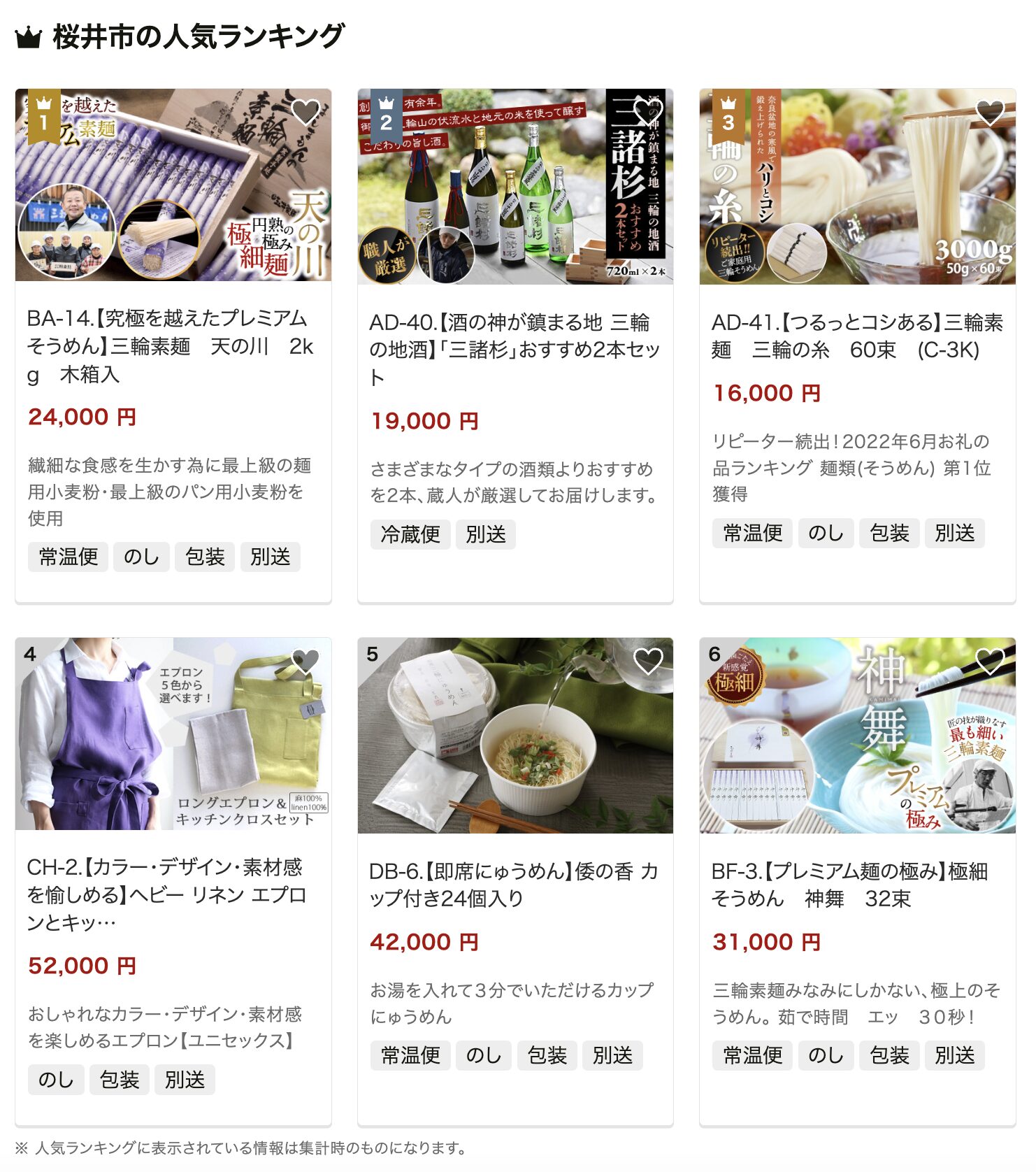 ふるさと納税の返礼品では、桜井市を代表する特産品「三輪そうめん」が特に人気を集めています。そうめん発祥の地として知られる三輪のそうめんは、極細でありながらしっかりとしたコシと風味が魅力で、多くのリピーターを獲得しています。 さらに、吉野本葛を使用したくずきりや奈良の伝統和菓子、地酒「三諸杉」など、地域の素材を活かしたグルメも充実しています。そのほかにも、職人が手掛ける工芸品や日用品、体験型の返礼品など幅広いラインナップが揃っており、歴史と文化を感じながら楽しめるのが桜井市の魅力です。グルメだけでなく伝統やストーリー性を重視したい方にもおすすめの自治体といえるでしょう。
