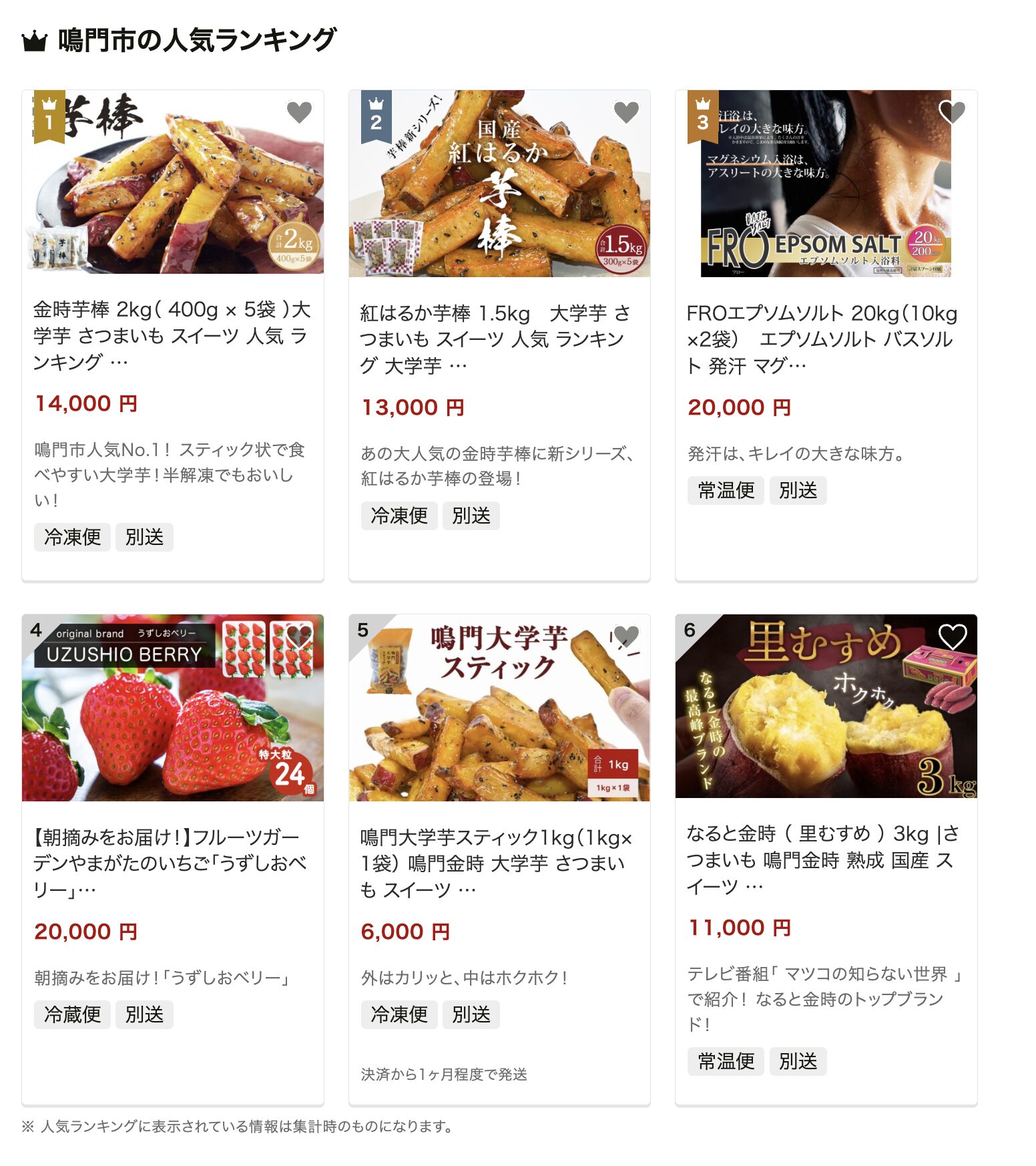また、鳴門産のわかめや海苔といった海産物も安定した人気を誇り、日常の食卓で使いやすい点が評価されています。さらに、さつまいも(鳴門金時)の生芋や加工品、地元特産を活かしたスイーツなども豊富に揃っており、幅広いニーズに対応しています。