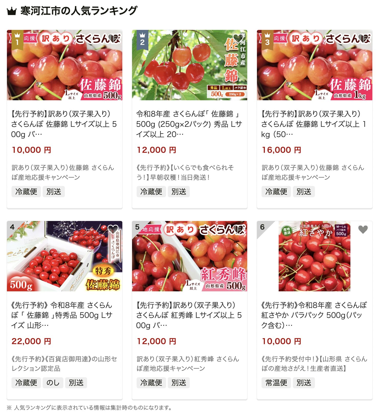 さらに、特秀ランクの佐藤錦や紅秀峰、紅さやかといった品種違いもランクインしており、食べ比べが楽しめる点も魅力です。訳あり品はコスパ重視、秀品は品質重視と目的に応じて選べるのもポイント。そのほかの返礼品もほぼさくらんぼで占められており、“とにかく美味しいさくらんぼを選びたい人”にとっては外せない自治体です。旬の短い時期に味わえる贅沢なフルーツを楽しめる点が、寒河江市の大きな魅力といえるでしょう。
