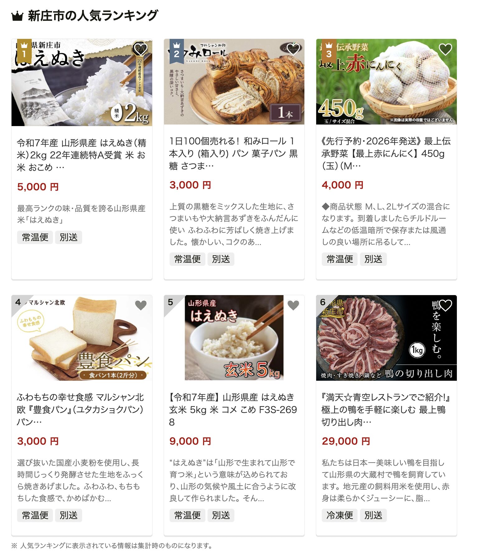 山形県新庄市のふるさと納税は、“米どころ山形”らしい高品質なお米と、地元ベーカリーの人気商品が上位を占めるバランス型のラインナップが特徴です。最新の返礼品ランキングでは、山形県産ブランド米「はえぬき(精米)」が1位となり、安定した美味しさとコスパの良さで高い支持を集めています。