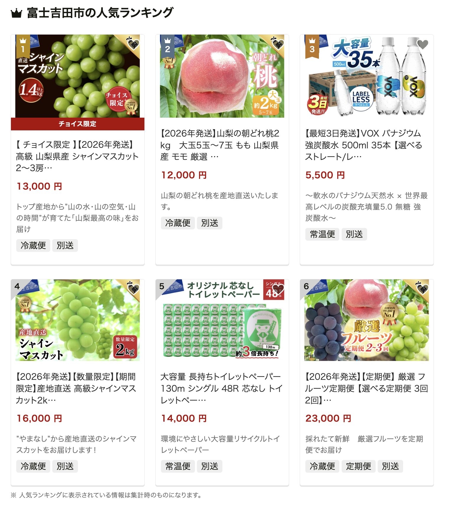食品から日用品、体験型まで幅広く揃う富士吉田市のふるさと納税は、実用性と地域の魅力を同時に感じられる内容。寄付を通じて、富士山の恵みを存分に体感してみてください。